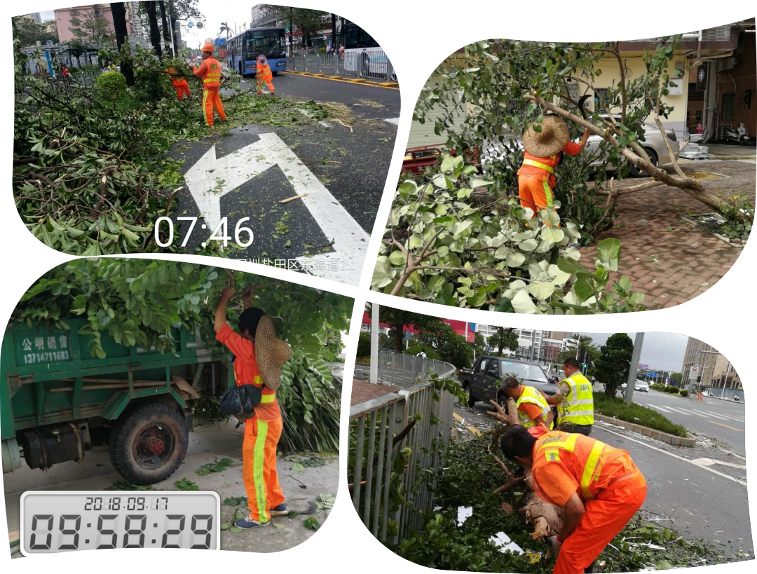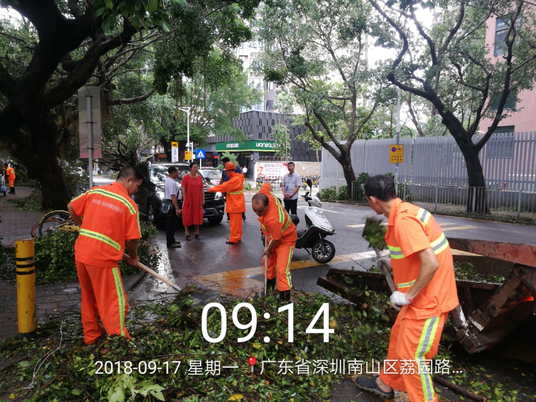 图为台风过后,深圳到处是倒地的树木树枝,及大量的落叶、垃圾,熊猫公司深圳各项目员工在现场抢险救灾,清理和疏通道路,第一时间清洁路面情况。 |