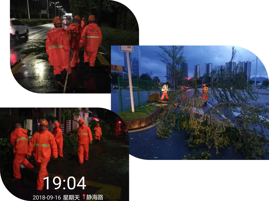 9月16日,特大台风“山竹”袭击了广东大部分地区,特别是深圳地区,尤为严重。熊猫人在“山竹”台风前后展开清洁大行动,并连夜疏通清理道路,保障人们生活的正常出行和安全。同时响应主管单位和各地街道办的统一部署,全力开展台风灾害清理工作。熊猫总经理亲临现场,指挥员工快速疏通重灾区的道路清理。 |