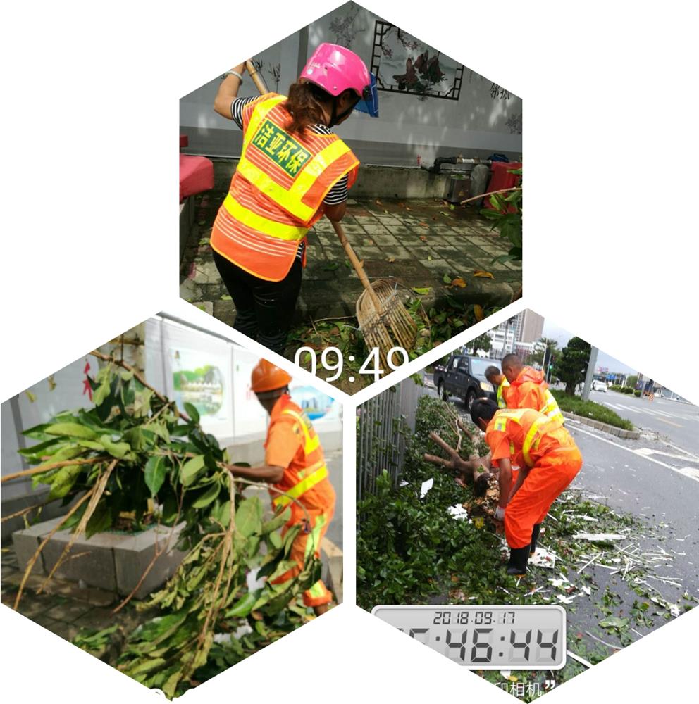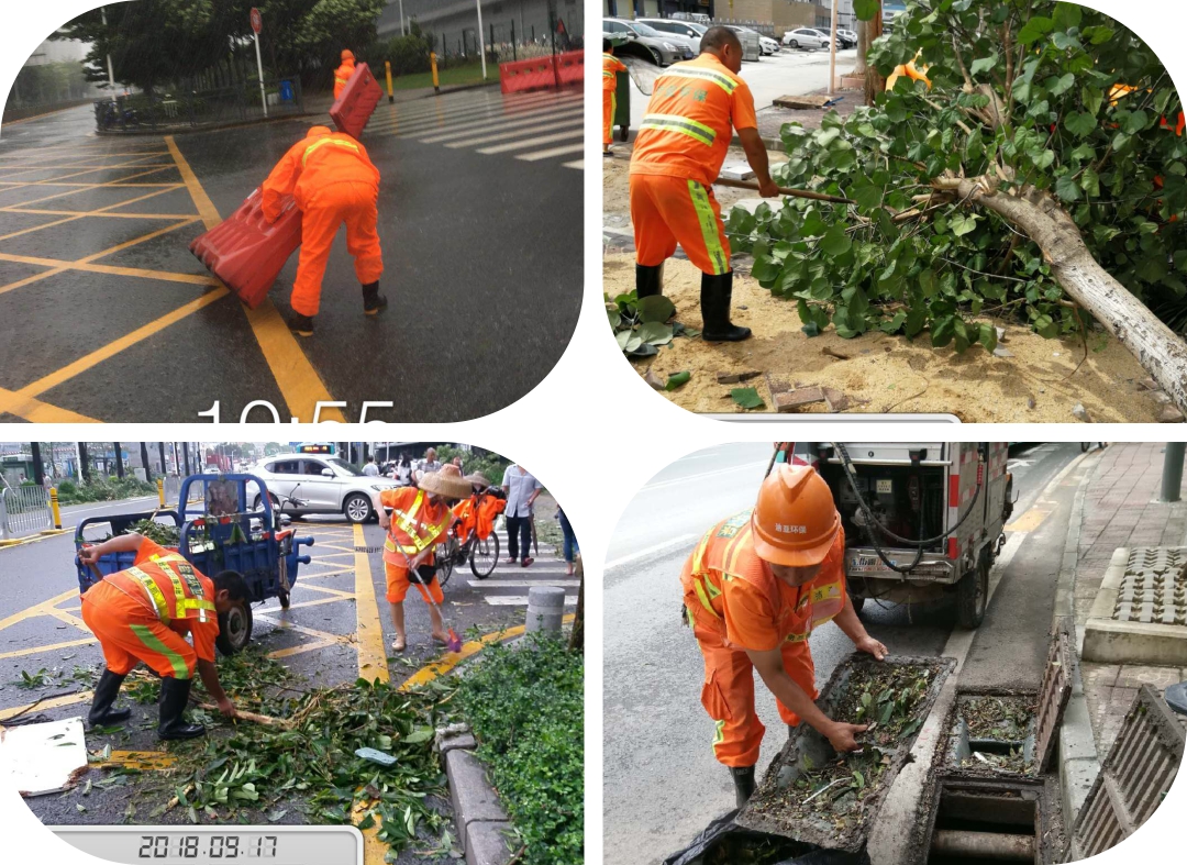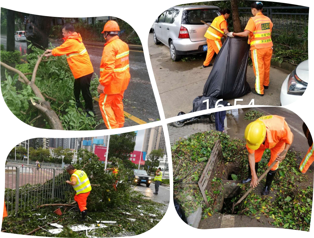 此次台风抢险中,熊猫人团结一心,充分发扬吃苦耐劳、不怕脏不怕累的环卫精神,全体总动员,投入到这次特大的台风抢险及清理中。 |