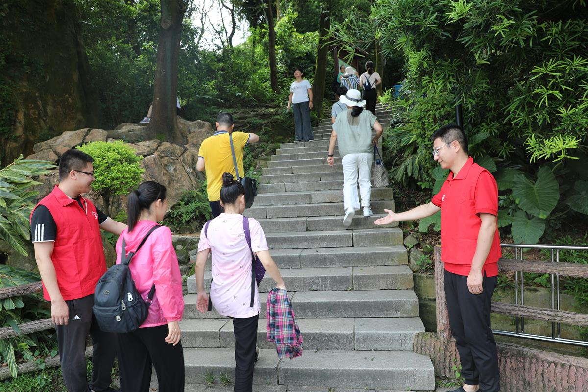 郁翠苍松,火红枫叶,百里争艳,疑似凤凰落九洲。7月6日上午,熊猫党支部、义工队穿着火红的义工服,化身“一只只火凤凰”,穿梭于凤凰山中,为前来观光的游客提供指引服务,帮助游客更好地找到登山的路和各景点的方位,并提醒游客爱护森林,保护环境。