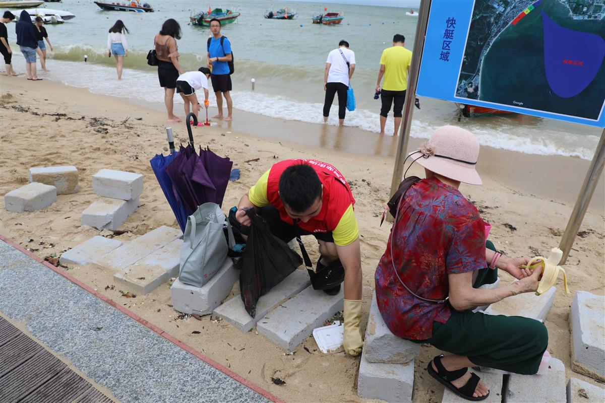 看,烟雨弥漫中,一条红龙正在海岸线延伸开来,那是我们熊猫的义工们穿上火红的义工服正在海岸和沙滩上清捡游客留下的垃圾,熊猫党员和义工们发扬不怕苦不怕脏不怕累的精神,正在一个一个清捡它们呢,随着这些垃圾被清理,此片海岸线又保持了她特有的魅力!