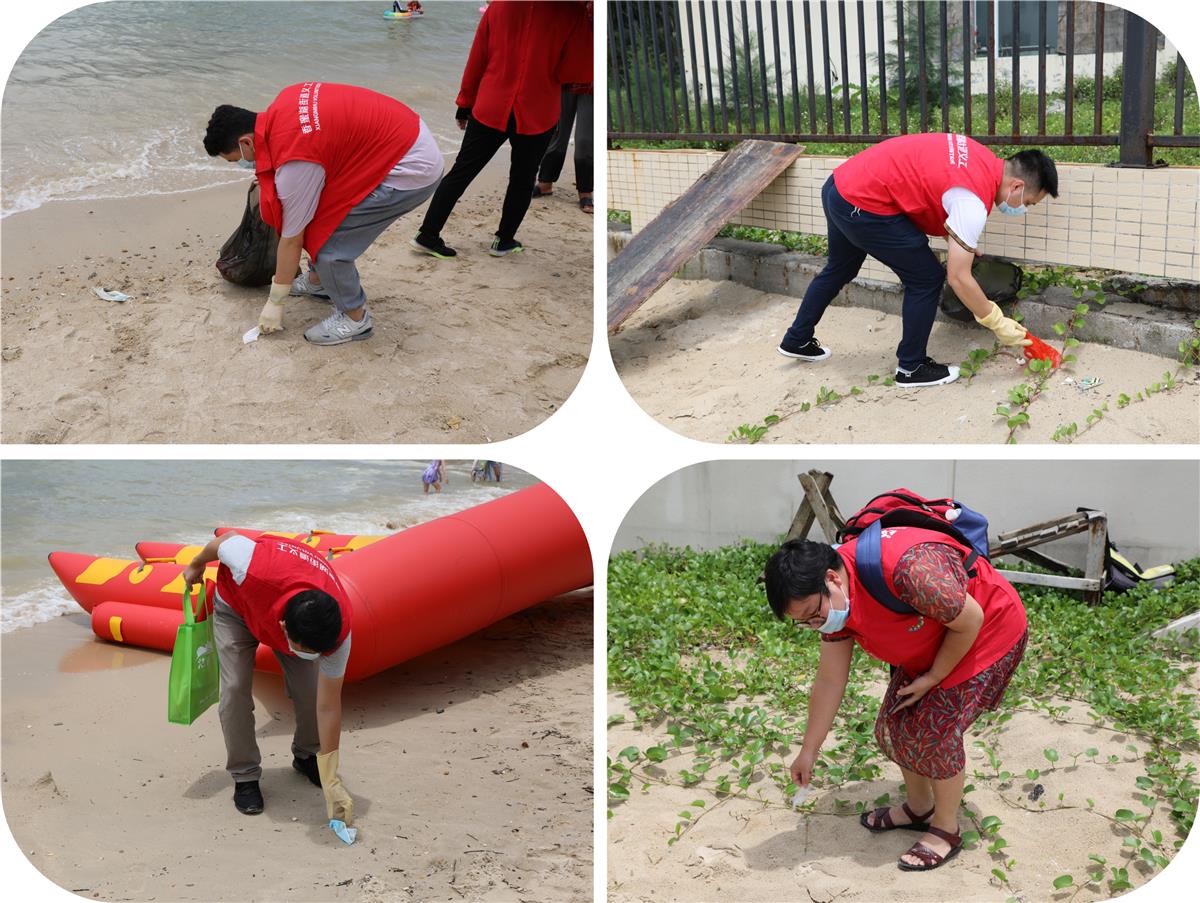 熊猫党员、义工们一早便来到了称之为世外桃源的大鹏较场尾海滩,这里碧水蓝天,十里银滩,金黄色的沙子在阳光的照耀下,显得分外迷人。这里远离市区,是背包客们常来的地方,他们在这里放飞自我,追逐嘻闹,尽情享受清新的空气和美丽的风景,还有一望无迹的海平面……然而这道美丽的风景线,也有一丝丝不经意间的瑕疵,那就是游客们尽情享受大自然馈赠的同时,也留下了一些白色垃圾。熊猫党员、义工们发挥先锋模范和为人民服务精神,一道道红色义工马夹像一条红龙,成为一道亮丽的风景线,所到之处,白色垃圾便被消灭,海滩又露出了迷人的笑容。