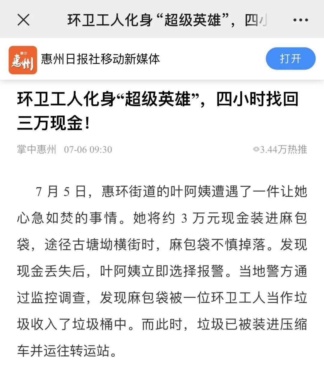 7 月 5 日,惠环街道的叶阿姨遭遇了一件让她心急如焚的事情。她将约 3 万元现金装进麻包袋,途经古塘坳横街时,麻包袋不慎掉落。发现现金丢失后,叶阿姨立即选择报警。当地警方通过监控调查,发现麻包袋被一位环卫工人当作垃圾收入了垃圾桶中。而此时,垃圾已被装进压缩车并运往转运站。