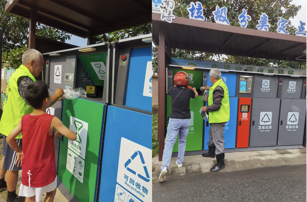 南浔区双林镇熊猫环保的垃圾分类督导员不辞劳苦地做好垃圾的分拣和监督,向居民宣传垃圾分类的知识。长假7天,熊猫环保垃圾分类督导员每天依旧会准时值守在垃圾分类集中投放点,检查居民送来的垃圾是否按要求分好类,并引导居民正确投放至不同类别的垃圾桶里。
